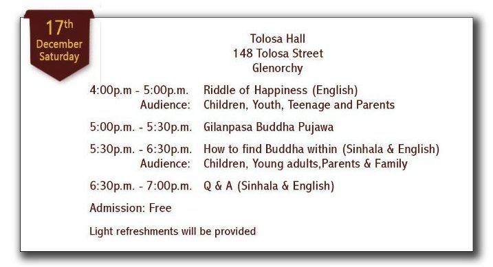 Born and having pursued his studies in the UK, the speaker Ven. Dharana Dassa Thero was a brilliant student. The Ven Thero then opted to enter a monastic life in Sri Lanka to complete his spiritual path towards Nibbana at the age of. 18. Aka ‘Dassa Thero’, continues to guide and support many young ones all over the world (Australia, UK, Canada etc) through his regular online programs since 2019.