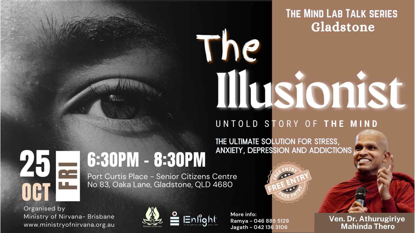 We are excited to bring you this special Mind Lab talk series in Brisbane! Join us for “The Illusionist – Untold Story of The Mind” presented by Ven. Dr. Athurugiriye Mahinda Thero. A former scientist at the Australian National University, he uniquely blends science and Buddhist philosophy to reveal the secrets behind happiness and the ultimate solution to stress, anxiety, depression and addictions. This is an opportunity you won’t want to miss!
